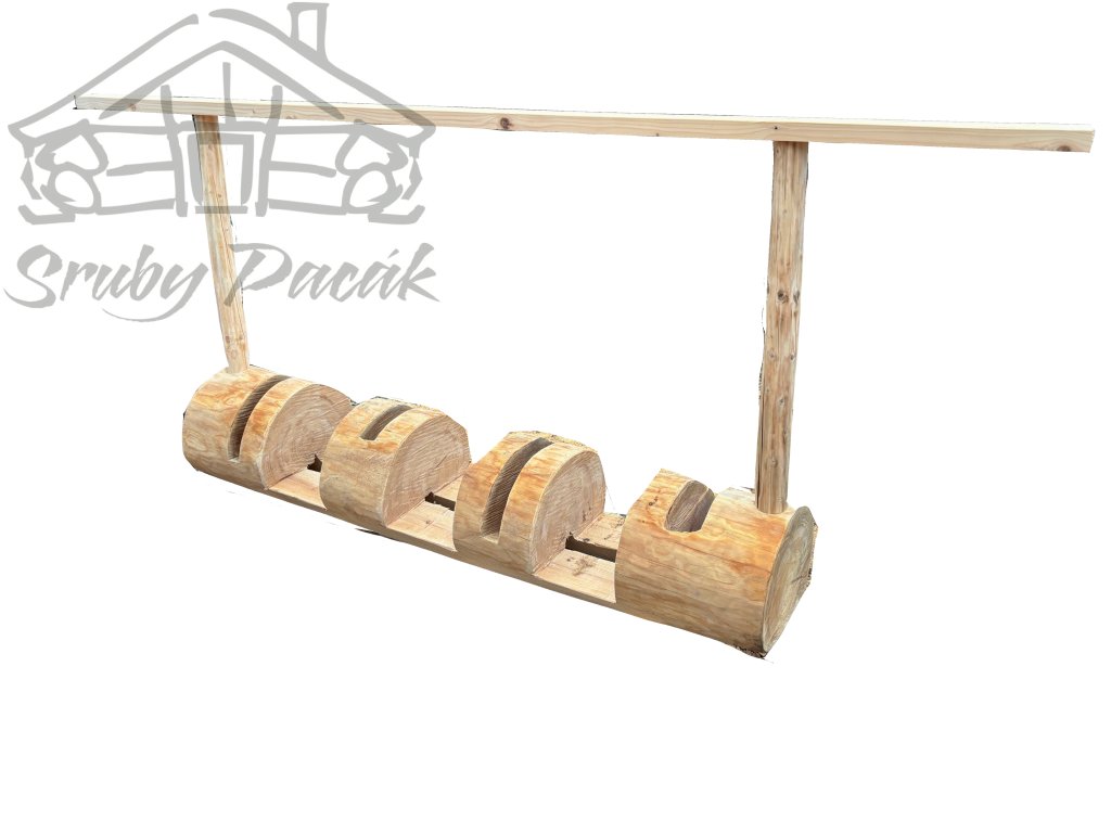 Masivní stojan na kola vyrobený z jedlového kmene. Délka spodní části je 2,2 m, délka horního trámku k zavěšení je 3 m. Kapacita je až osm kol a můžete ho použít na všechny typy kol.