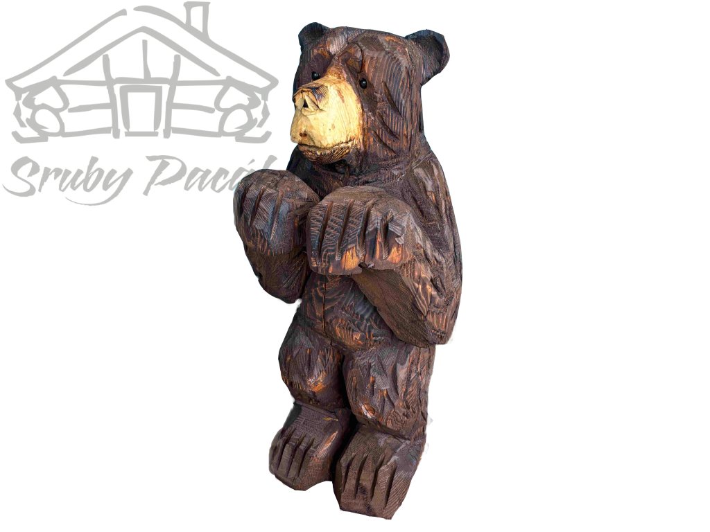 Dřevěná socha Medvěda. Medvěd vyřezaný motorovou pilou z jednoho kusu kmene (jedle nebo smrk), celková výška sochy cca 90 cm. Povrchově upraven opálením. Sochu medvěda je možné postavit na podstavec (není v ceně) a přichytit k parapetu okna nebo k desce stolu. Na zádech je řez eliminující praskání sochy.