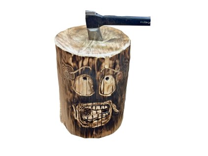 Kulatý špalek na štípání dřeva s vystrašeným obličejem.